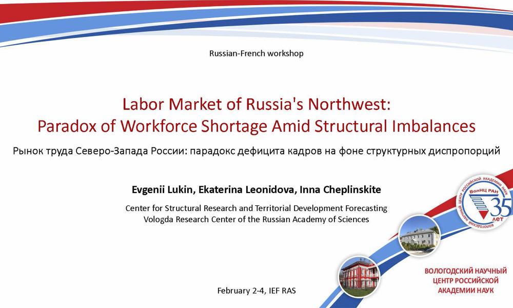 2-4 февраля 2026 года в Москве состоялась LXVIII сессия Российско-французского научного семинара, организованного Институтом народнохозяйственного прогнозирования РАН (ИНП РАН) и Центром исследований моделей индустриализации (CEMI, Франция). В рамках сессии заведующий Центром структурных исследований и прогнозирования территориального развития кандидат экономических наук ВолНЦ РАН Е.В. Лукин представил результаты анализа ключевого парадокса современного рынка труда Северо-Западного федерального округа, полученные в рамках темы государственного задания № FMGZ-2025-0012 «Структурно-технологическая трансформация региональной экономики в условиях обеспечения национальной безопасности Российской Федерации: мониторинг, регулирование и прогноз».