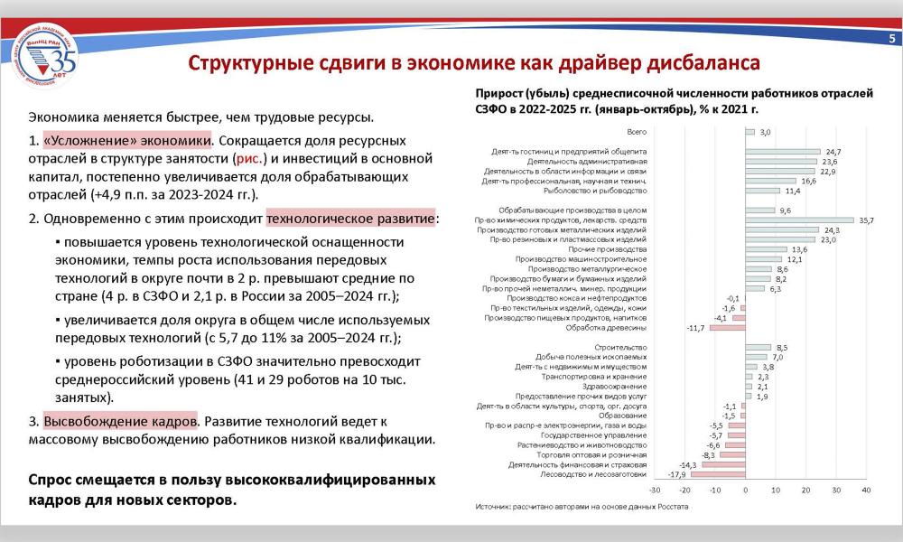 В рамках сессии Е.В. Лукин представил результаты анализа ключевого парадокса современного рынка труда Северо-Западного федерального округа: одновременного существования острого дефицита кадров, особенно квалифицированных, и структурной безработицы. Исследование основано на данных Росстата, экспертных опросов ВолНЦ РАН и анализе вакансий. Докладчик подробно осветил фундаментальные причины сложившейся ситуации, включая демографический спад, отставание системы образования от потребностей экономики и технологические сдвиги. Особое внимание было уделено территориальным диспропорциям внутри СЗФО и системным рискам для модернизации экономики.