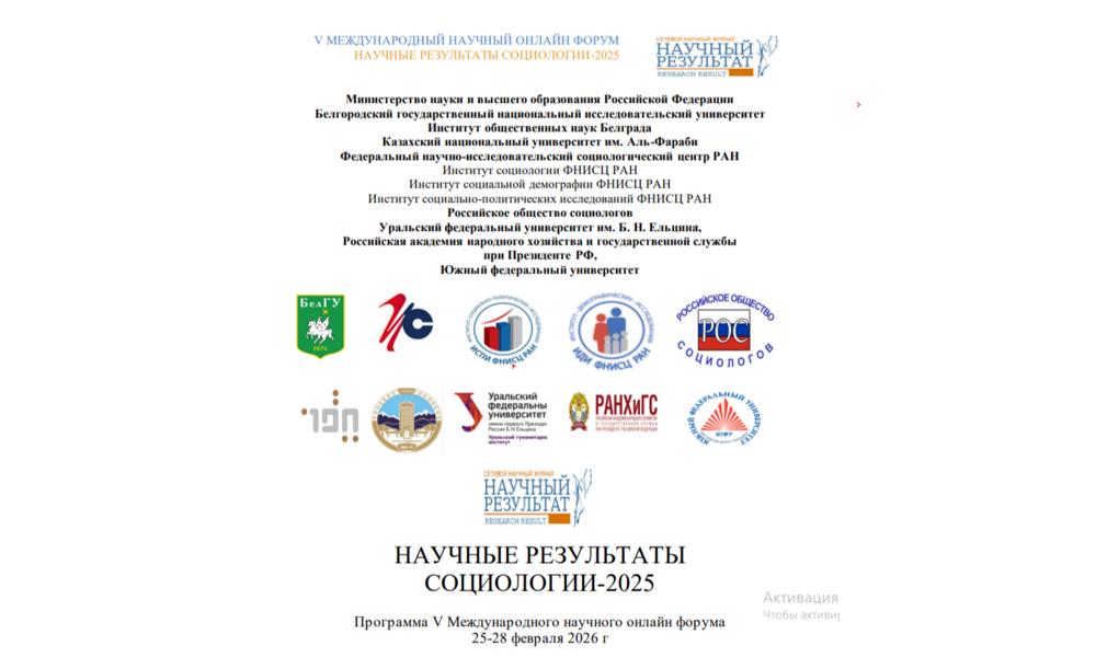 С 25 по 28 февраля 2026 года на базе Белгородского государственного национального исследовательского университета проходил V Международный научный онлайн-форум «Научные результаты социологии–2025». Мероприятие объединило исследователей для обсуждения актуальных работ, опубликованных в научной периодике текущего года. Работа форума была организована по ряду тематических направлений, включая социологию культуры и религии, образования, молодежи, управления, а также отдельную секцию для аспирантов и молодых ученых. Вологодский научный центр РАН представили сотрудники Центра социокультурных и политических исследований – в.н.с., зав. Центром к.э.н. Ксения Евгеньевна Косыгина и м.н.с. Ангелина Эдуардовна Жданова.