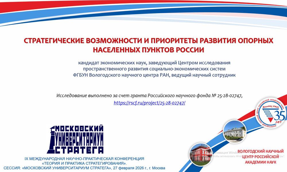 Заведующий Центром исследования пространственного развития социально-экономических систем, в.н.с. к.э.н. С.А. Кожевников презентовал доклад «Стратегические возможности и приоритеты развития опорных населенных пунктов России», в котором представил некоторые результаты реализации гранта РНФ № 25-28-02747 «Модернизация малых городов России на основе активизации межмуниципальных социально-экономических связей». Внимание докладчика было сфокусировано на научном обосновании приоритетов развития опорных населенных пунктов с учетом обостряющихся вызовов развития внешней и внутренней среды, что позволит превратить их в точки роста регионального и субрегионального уровней.